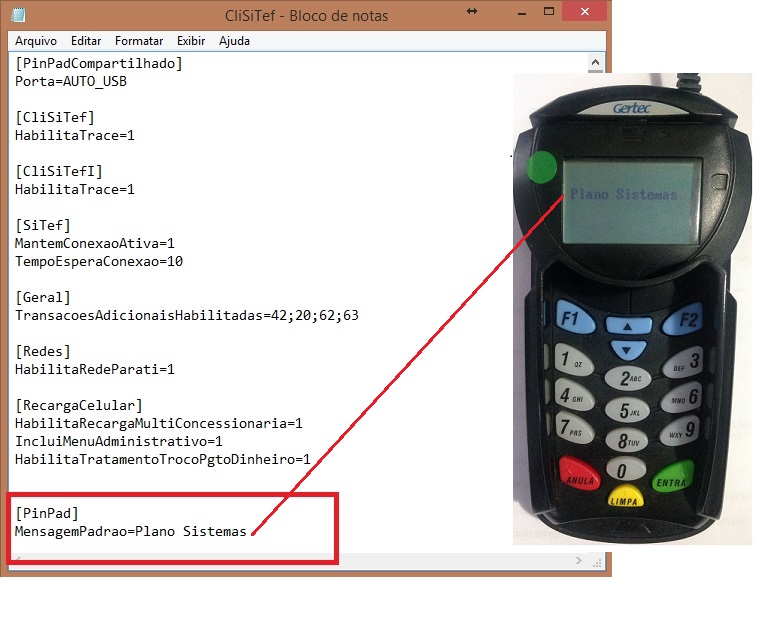 Conforme citado anteriormente, o campo Mensagem da tela de configuração de Sitef, não é necessário preencher, porém, se desejar, pode se informar no arquivo de configuração do sitef. Para isso, acesse o arquivos texto chamado CliSiTef localizado na no diretório C:\clisitef, e na secão [PinPad] e no campo MensagemPadrao, informe a mensagem desejada, esta mensagem estará fixa na tela do PinPad.