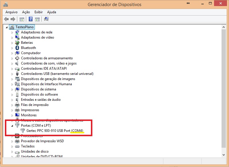 Ao abrir o Gerenciador de Dispositivos, em Portas (COM e LPT), será apresentado o equipamento PinPad pré-configurado e a porta de comunicação.