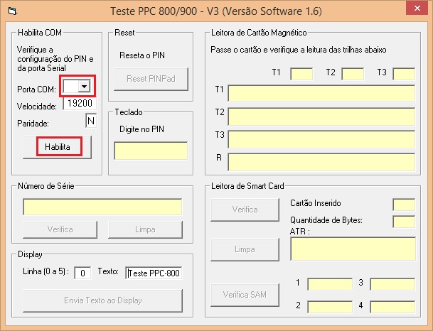 Para realizar o teste de comunicação, execute o aplicativo Teste PPC. Ao executar, selecione a Porta COM e clique em Habilitar.